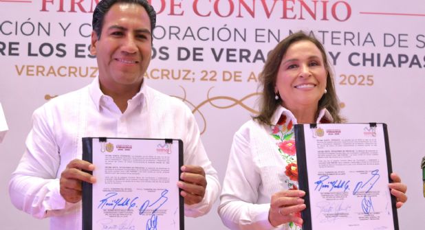 VERACRUZ, VER.- Los gobernadores de Veracruz y Chiapas, Rocío Nahle García y Eduardo Ramírez Aguilar, firmaron un convenio de colaboración en materia de seguridad con el objetivo de reforzar la vigilancia en el sur-sureste del país. El acto se llevó a cabo este viernes 22 de agosto en el Faro Venustiano Carranza, en el puerto de Veracruz.