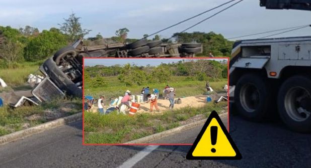 La pesada unidad transportaba toneladas de maíz, las cuales quedaron esparcidas a un costado de la vía. Tras la volcadura, el conductor logró salir por cuenta propia, sin sufrir lesiones.