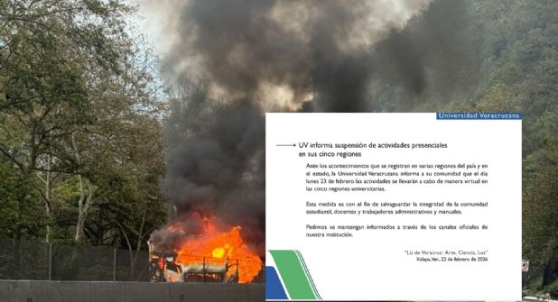 VERACRUZ, VER.- La Universidad Veracruzana (UV) anunció la suspensión de actividades presenciales en las cinco regiones del estado debido a los bloqueos e incendios de tráileres que presentados desde la mañana de este domingo 22 de febrero en diversos municipios de Veracruz, tras el abatimiento de "El Mencho".