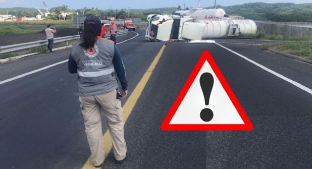 La volcadura de una pipa con diésel sobre el distribuidor vial de la localidad de San Julián, en la autopista Veracruz-La Antigua, provocó el cierre vial por varias horas y el despliegue de personal de emergencias en la zona durante la mañana de este miércoles 2 de noviembre del 2022.