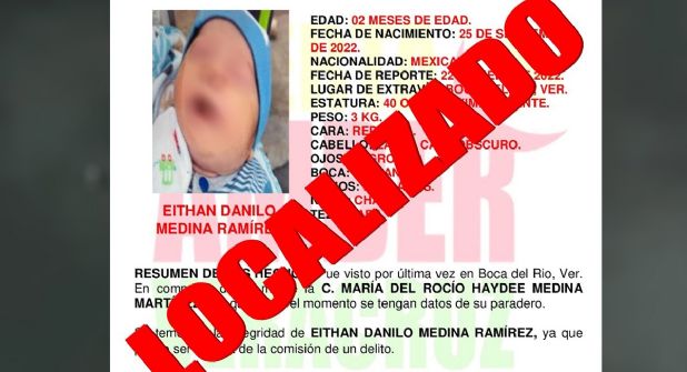 Autoridades de Veracruz confirmaron la localización del bebé identificado como E. D. M. R., de dos meses de edad, el cual fue reportado como desaparecido el pasado 22 de noviembre en la ciudad de Boca del Río. El menor quedó bajo resgaurdo en las instalaciones del DIF Municipal este 25 de noviembre.