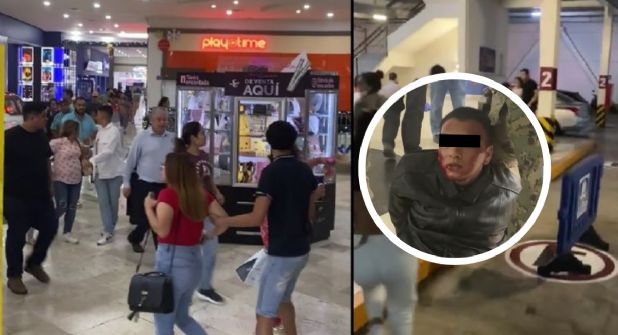 Elementos de Seguridad logran detener al sujeto que presuntamente ingresó armado a la sala 9 del Cinépolis de Plaza Américas. Lo limitaron de las manos y fue sacado del centro comercial por la SSP de Veracruz.