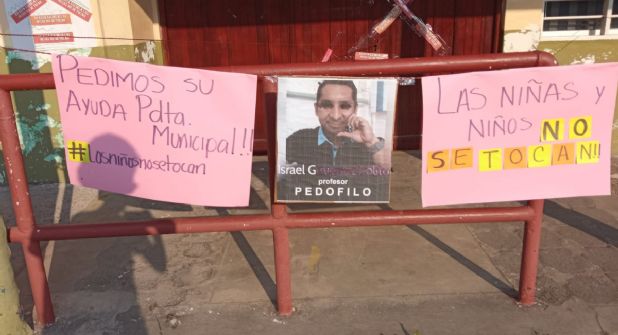 “Las niñas no se tocan”, es la frase que se lee en varias pancartas pegadas en la fachada de la Escuela Primaria Federal Tablajeros Número 1, cuyas instalaciones fueron tomadas por padres de familia que este miércoles 7 de febrero exigieron a las autoridades ministeriales que detengan al maestro Israel N, quien está acusado por el delito de abuso sexual en contra de cinco menores de edad.
