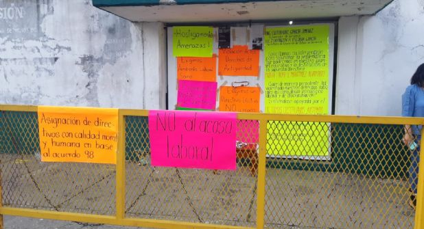 "Tenemos un conflicto, porque viola nuestros derechos laborales, sindicales, nos intimida psicológicamente, tenemos este tipo de agresión, agresión emocional, el autoestima de los compañeros, pues ya no quieren venir ni a la escuela; además que discrimina a las personas", señala.