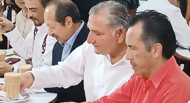 Adán Augusto López fue arropado por el gobernador Cuitláhuac García y miembros de su gabinete, así como representantes del Congreso del Estado durante un desayuno en un tradicional café el malecón, posteriormente encabezaron un foro sobre la reforma electoral en el World Trade Center de Boca del Río.