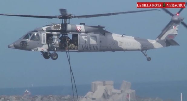 Los ejercicios continuaron con el desembarque a rapel de elementos de Infantería de Marina desde el helicóptero Black Hawk sobre la playa Punta Azul, minutos después otro grupo de marinos saltaron al mar desde las patrullas interceptoras y finalmente siete embarcaciones tipo Zodiac llegaron hasta la orilla con otro grupo de marinos, que al final de ejercicio pasaron lista frente a sus mandos.