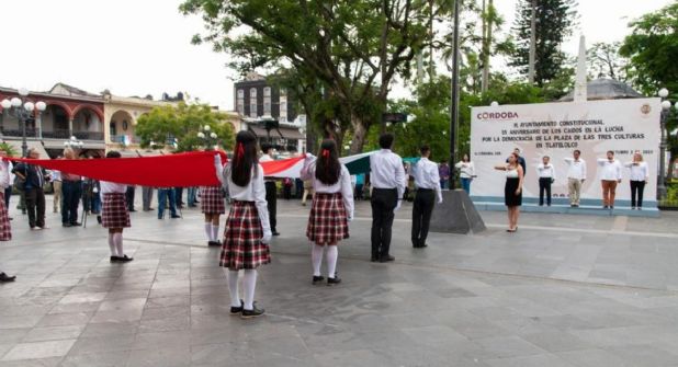 CÓRDOBA, VER.- Autoridades municipales encabezados por el presidente municipal de Córdoba, Juan Martínez Flores, ediles y alumnos del telebachillerato de Agustín Millán, conmemoraron el 55 Aniversario de los Caídos en la Lucha por la Democracia de la Plaza de las Tres Culturas en Tlatelolco.