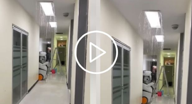 En el video de 10 segundos está el pasillo inundado mientras el agua se filtra por dos de las lámparas del techo. Al fondo está una escalera, dos cubetas de agua y una máquina parte del equipo médico especializado necesario para atender pacientes.