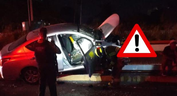 Un automóvil Nissan Versa donde iban abordo 2 mujeres y 1 hombre quedó completamente destruido. El barandal atravesó el motor del vehículo hasta llegar a la ventana de lado del conductor, ocasionando graves daños a los pasajeros.