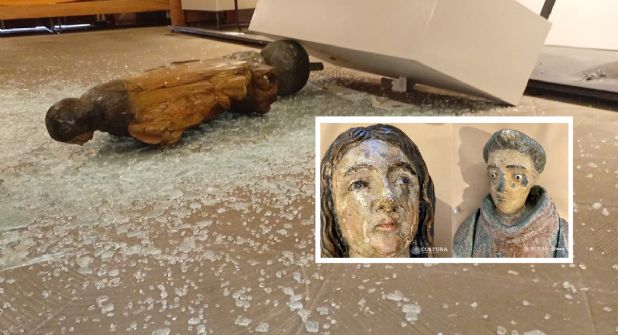 “La base museográfica se venció ocasionando que la vitrina se inclinara y cayera al suelo, destruyéndose el capelo de cristal templado y provocando la caída de las esculturas religiosas que se encontraban en ella: una de metal y otra de madera”, se lee en el comunicado.