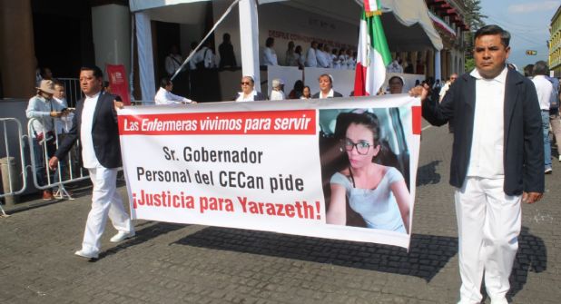 XALAPA, VER. – Este lunes en el Desfile del Día del Trabajo y frente al gabinete de gobierno en donde estaba presente Cuitláhuac García Jiménez, Gobernador del Estado, trabajadores del Centro Estatal de Cancerología (CECAN) exigieron justicia por el feminicidio de su compañera, la enfermera Yarazeth Zepeta García, quien atendía a pacientes con cáncer y fue asesinada al interior de su domicilio en Xalapa.