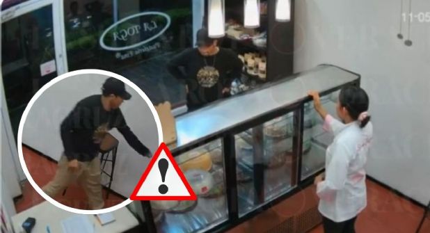 En punto de las 20:40 horas de la noche el joven entra al local y pregunta a la empleada sobre unos pasteles en el refrigerador del mostrador. El asaltante primero finge que va a comprar un pastel tipo “Milky”, e incluso, saca su cartera a la par de que le señala a la joven que lo atiende el pastel que “llevará”.