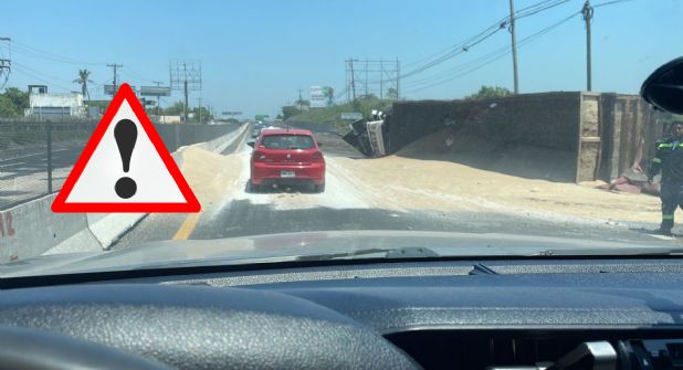 VERACRUZ, VER.- Un tráiler que contenía abono se volcó mientras circulaba sobre la desviación del libramiento portuario de la ciudad de Veracruz, conocido como kilómetro 13.5, que conecta con la autopista Veracruz-Cardel de la zona norte de la ciudad.