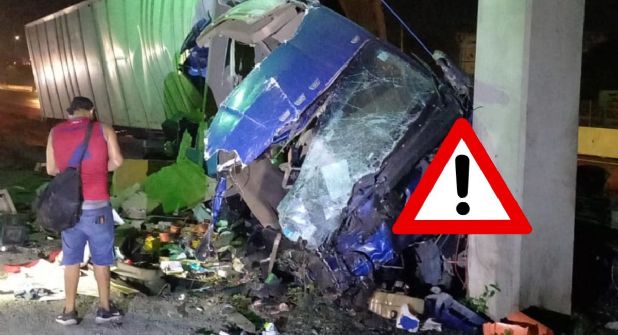 Según testigos de la zona, el tráiler perdió el control a exceso de velocidad y chocó directamente con la columna de concreto. Debido a la fuerza del impacto, el tráiler quedó completamente destrozado de uno de los costados, dejando expuesta la mitad de la cabina y parte del contenedor.