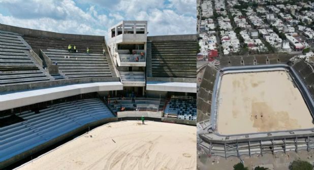 Mientras que en el exterior del recinto de fútbol, se labora en el montaje de estructura de piel y tela envolventes, rehabilitación de oficinas administrativas, colado de losas del edificio Mantarraya, pavimento hidráulico en área de estacionamiento y colocación de malla perimetral (euromalla).