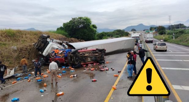 Fue la mañana de este jueves cuando se reportó a los números de emergencia un choque por alcance múltiple en la autopista Córdoba - Veracruz dirección Veracruz, justo en el kilómetro 297, en la zona del Trébol de Amatlán. Un tráiler que remolcaba una caja seca cargada con cajas de refrescos volcó ocupando ambos carriles del sentido.