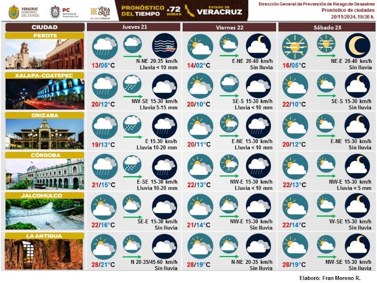 Este jueves 21 de noviembre en la ciudad de Xalapa, se pronostica un día con nublados la mayor parte del día, lluvias con acumulados de entre 5 a 15 mm en promedio durante la mañana y tarde, y descenso de temperaturas de entre los 20°C y 12°C. Además, se esperan vientos con dirección del Noroeste al Sureste con velocidades de entre 15 y 30 km/h.