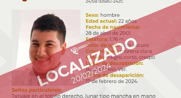 VERACRUZ, VER. - La Comisión Estatal de Búsqueda de Veracruz (CEBV) informó a través de su cuenta oficial de Facebook que Luis Agustín Sosa Andrade, estudiante de la licenciatura de Ingeniería de la Universidad Veracruzana (UV), fue localizado con vida durante la tarde de este martes 20 de febrero.