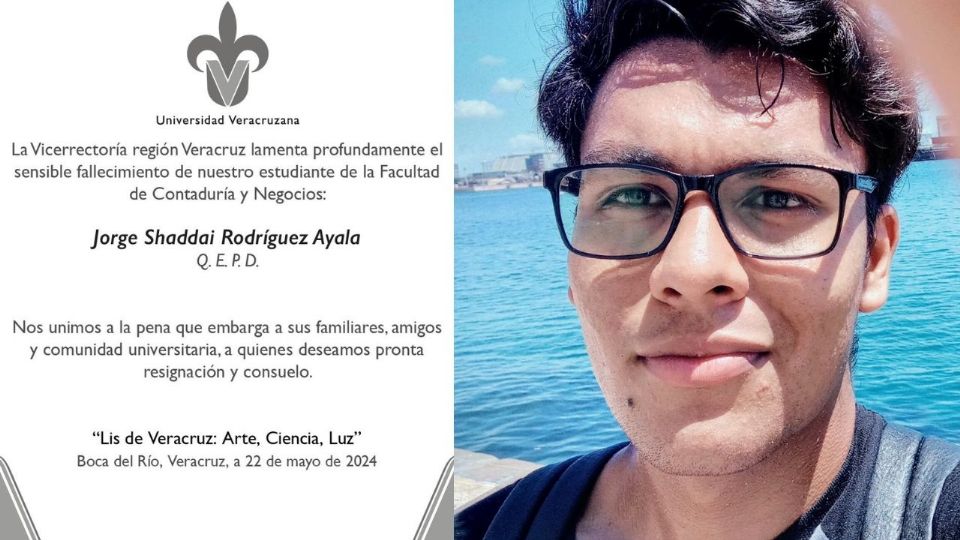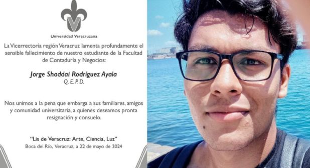 La Vicerrectoría región Veracruz lamenta profundamente el sensible fallecimiento de nuestro estudiante de la Facultad de Contaduría y Negocios: Jorge Shaddai Rodríguez Ayala (QEPD). Nos unimos a la pena que embarga a sus familiares, amigos y comunidad universitaria, a quienes deseamos pronta resignación y consuelo", dice el mensaje.