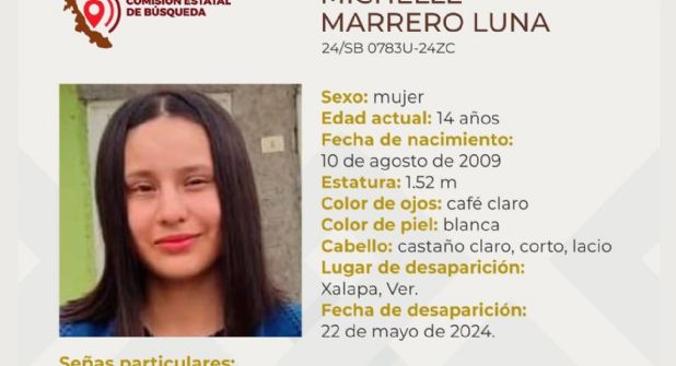 VERACRUZ, VER.- La Comisión Estatal de Búsqueda Veracruz (CEBV) emitió una ficha de búsqueda para localizar a la joven Michelle Marrero Luna que desapareció el 22 de mayo de 2024 en la ciudad de Xalapa. Sus familiares también compartieron la foto de la adolescente en redes sociales y señalaron que desapareció cerca del Santuario de Las Garzas.