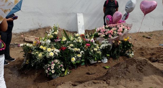 VERACRUZ, VER. - Docenas de flores y globos fueron colocados en la tumba de Jessica González Martínez, asesinada el pasado domingo 9 de junio al interior de su casa en la colonia Predio 4 de la ciudad de Veracruz. A dos días de su feminicidio, amigos, familiares y sus dos hijos se reunieron en el Panteón Municipal para darle el último adiós.