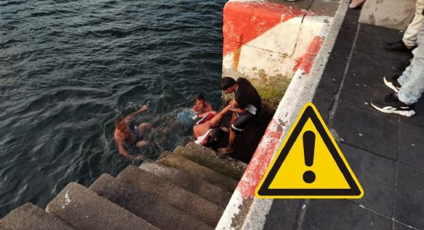 Los sacamonedas lograron ponerlo a flote y entre los 3 lo arrastraron por el agua hasta las escaleras que dan acceso al mar en esta zona. El joven fue sacado de nuevo a tierra y lo acomodaron en una banca para que retomara el aliento, mientras que lo alejaron de la orilla.