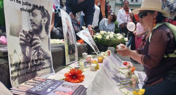 El grupo que colocó una pequeña ofrenda en la Plaza Regina, lugar donde Rubén daba cobertura a las manifestaciones sociales, reprochó la impunidad que prevalece en el caso y que las autoridades se nieguen a abrir una línea de investigación que incluya su profesión como la causa de su muerte.