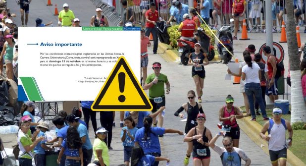 "Por las condiciones meteorológicas registradas en las últimas horas, la Carrera Universitaria ¡Corre, trota, camina! será reprogramada en Xalapa para el domingo 13 de octubre en el mismo horario y se utilizará el mismo kit que fue entregado a las y los participantes"
