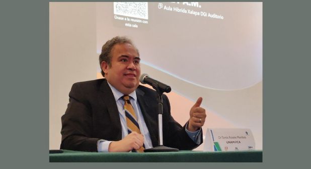 Tomás Rosales Mendieta, catedrático de la Universidad Nacional Autónoma de México (UNAM), al dictar una ponencia en el auditorio de la Dirección General de Investigaciones (DGI) de la Universidad Veracruzana (UV).