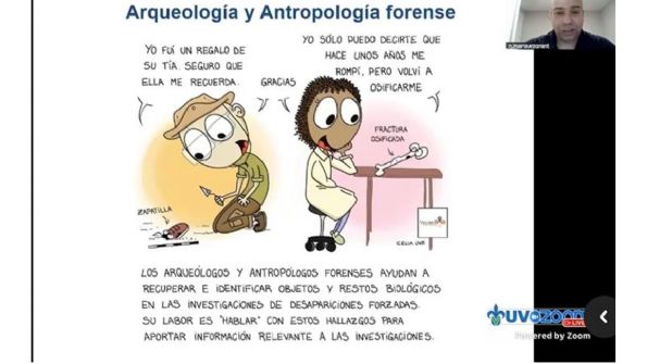 A través de la virtualidad, atentos a la conferencia estuvieron María Antonia Aguilar Pérez, directora de la Facultad de Antropología; Violeta Vázquez Campa, coordinadora de la Especialización en Arqueología Forense, así como docentes y estudiantes de la licenciatura y de los cinco posgrados enmarcados en el Programa Universitario para la Atención de Problemáticas de Desaparición de Personas e Identificación Humana.