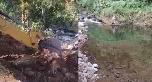 En uno de los videos grabados por Amigos del Pixquiac el 19 de marzo y publicado el lunes 24 desde su cuenta de Facebook, se ve la maquinaria con una “mano de chango” acarreando tierra y piedra a un costado del río, en el municipio de Tlalnehuayocan, en los terrenos de la cuenca media del río Pixquiac.