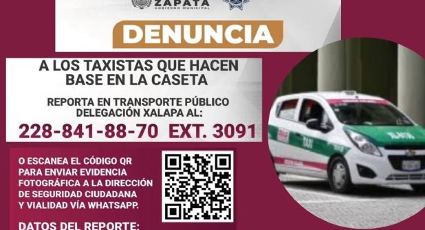Así, en las paradas de Las Trancas, así como en las del fraccionamiento Bugambilias y Santa Lucía, en la congregación Jacarandas, se encuentra visible el teléfono de la DGTSV delegación Xalapa 228 841 88 70 extensión 3091; y el de la DSCV municipal 228 820 07 58 que cuenta con WhatsApp para recibir la fotografía del taxi, número económico, placa, fecha y hora.