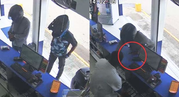 En el momento que la caja registradora se abre, el asaltante, que portaba una camiseta de manga larga, desenfunda rápidamente un arma de fuego de su pantalón con la que apunta al despachador.