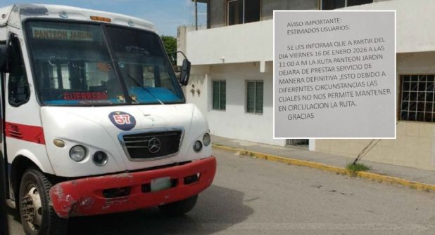 VERACRUZ, VER.- La ruta de camión Panteón Jardín dejará de prestar servicio de manera definitiva en el puerto de Veracruz, a partir de este viernes 16 de enero, de acuerdo con un aviso que comenzó a circular en redes sociales y que, según usuarios, también fue colocado en algunas de las pocas unidades que aún operan.
