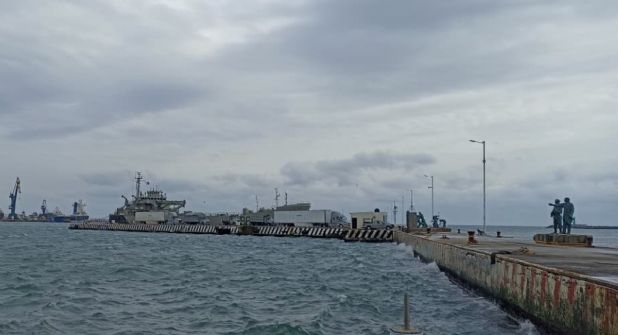 El buque ARM Isla Holbox (BAL 02) permanece en el muelle de los Pescadores este jueves 5 de febrero en medio de tráilers, camiones de volteo y algunas camionetas de la Secretaría de Marina.