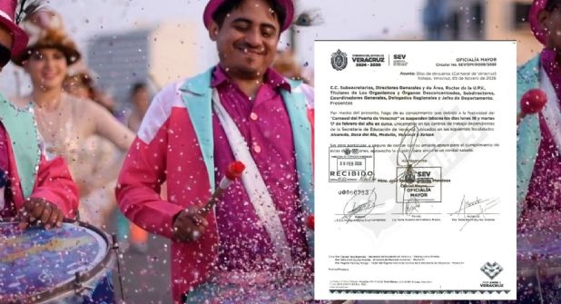 XALAPA, VER.- La Secretaría de Educación de Veracruz (SEV) informó que, con motivo de la celebración del Carnaval del Puerto de Veracruz, se suspenderán labores educativas durante la próxima semana en algunos municipios de la entidad.