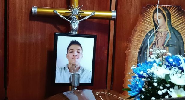 El lugar está en completo silencio, solo el viento que sopla en el exterior rompe por momentos con la calma del sitio. Las miradas se concentran en el suelo, menos la de ella que se encuentra perdida en la fotografía de Jocksan Gabriel, colocada sobre el ataúd que está bordeado de flores.