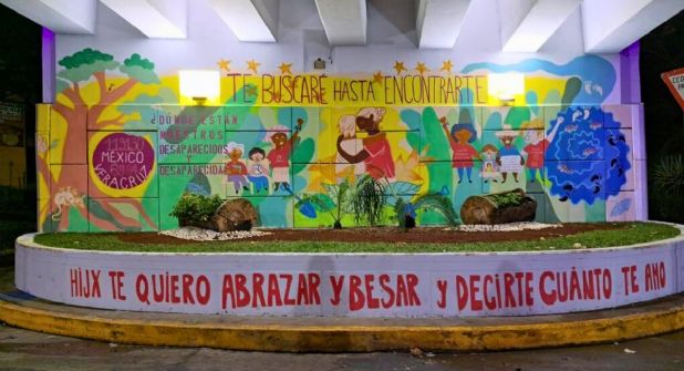 Lo colorido de los dos pilares y el muro, que sostiene el transitado puente que comunica a Maestros Veracruzanos, contrasta con el fenómeno de la desaparición de personas en Xalapa que, pasó de ser nombrada la capital de Las Flores, a Xalapa de las desapariciones, mote que impusieron los Colectivos a la ciudad.