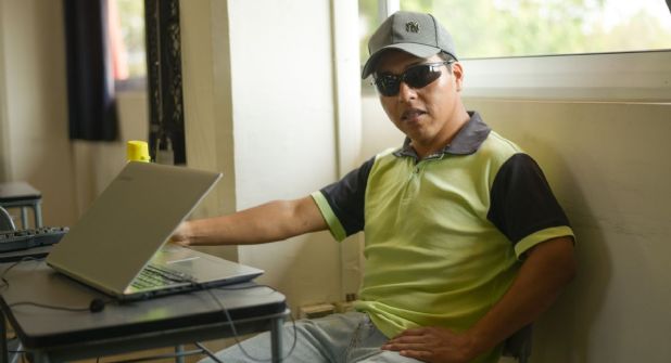 XALAPA, VER.- Ángel Anastasio García ya no puede ver, pero está poniendo todo su empeño en estudiar la licenciatura de Derecho en el Sistema de Enseñanza Abierto de la Universidad Veracruzana (UV) en Xalapa. El universitario comenzó a perder la visión durante su adolescencia a causa del glaucoma, enfermedad que le causó ceguera y le quitó la posibilidad de seguir tocando su instrumento favorito, la batería.