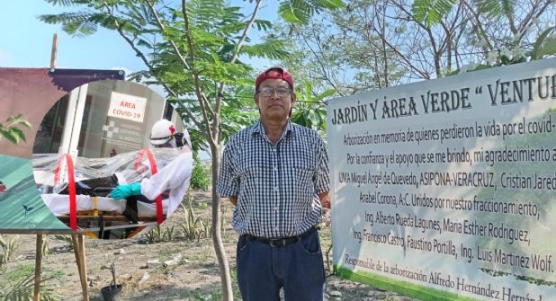 VERACRUZ, VER. - Al filo de un barranco, donde hace años pasaba un río con extenso caudal y que ahora es rellenado por una empresa constructora encargada de hacer casas de interés social, fue colocado el Jardín y área verde Ventura, un pequeño espacio que Alfredo Hernández acondicionó para sembrar árboles en memoria de las víctimas por covid-19 en el municipio de Veracruz.