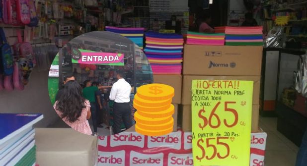 Los locales comerciales en el primer cuadro de la ciudad muestran cartulinas fosforescentes, ofrecen descuentos en artículos escolares para atraer a los compradores, otras más se usan para dar instrucciones de entrada y salida de los pequeños espacios que están llenos de cajas, estantes y artículos de papelería.