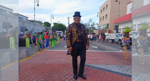 El hombre de 59 años, de porte firme y con semblante serio, esconde más de media vida de participar en los desfiles carnavalescos. Aunque hace apenas 3 años recibió la distinción de Bastonero Real, asegura que su historia en el carnaval es de varias décadas.
