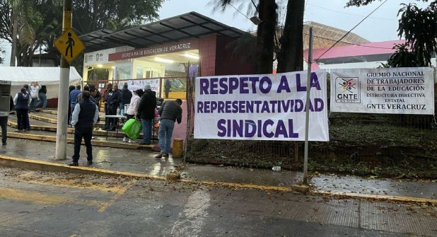 Este lunes 24 de febrero, los trabajadores sindicalizados llegaron desde las siete de la mañana a las instalaciones de la SEV donde colocaron lonas y cerraron el acceso a los trabajadores, como una medida de protesta al programa El Maestro al Aula, y pidieron asignar las más de 20 mil horas que fueron autorizadas en la pasada administración para cubrir interinatos.
