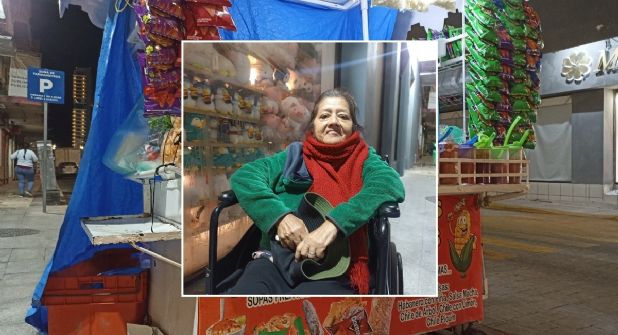 Luz del Carmen está cubierta con una bufanda larga, un suéter y una falda que cubre sus tobillos del frío. Su nieto Fernando, de 23 años y criado en el mundo del comercio informal, sostiene su silla de ruedas ubicada al costado del puesto de esquites que levantó durante décadas.