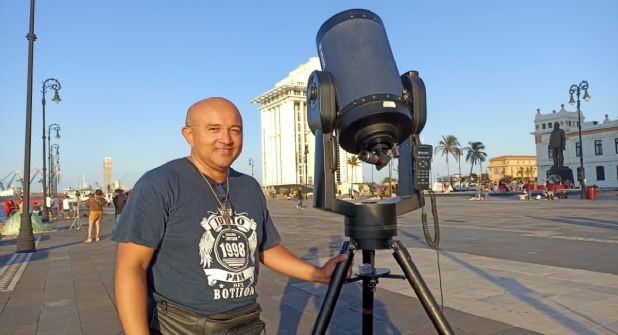 VERACRUZ, VER.- Poco antes de atardecer, Sergio Hernández llega al Malecón de Veracruz con el telescopio que él describe como “el más potente exhibido al público”. Con un lente de 10 pulgadas de ancho que permite la mayor cantidad de luminosidad posible para obtener una imagen de alta calidad, Júpiter y sus lunas dan un espectáculo único en la ciudad.