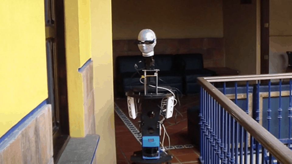 Cuenta además con dos equipos de cómputo, base móvil para una cámara RGB-D con movimientos de giro e inclinación, a través de la cual se obtienen imágenes del entorno e información tridimensional del espacio en el que se mueve mediante un sensor de distancia.