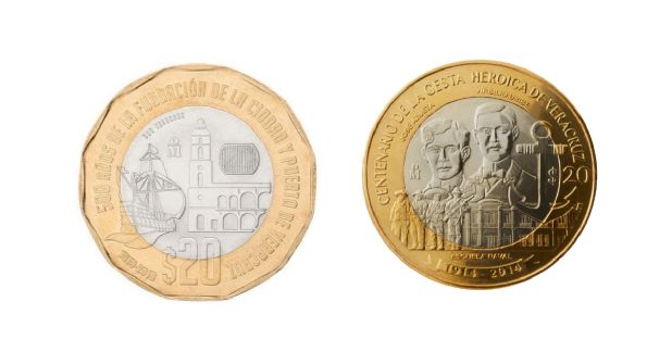 Una de las monedas más recientes y conocidas es la puesta en circulación en 2019, por los 500 años de la Fundación de la ciudad y puerto de Veracruz, que tiene entre sus principales características un Escudo Nacional en relieve plateado y la leyenda de “500 años de la fundación de la ciudad y puerto de Veracruz”.