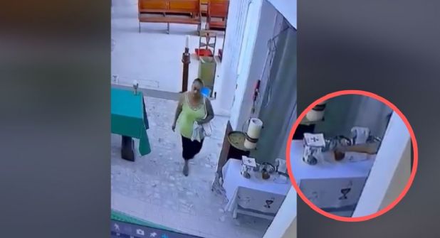 En el video se observa cómo una mujer vestida de blusa verde y falda negra aprovecha la poca afluencia dentro de la parroquia, para acercarse al altar, y guardar en su bolsa unos cuantos objetos eclesiásticos.