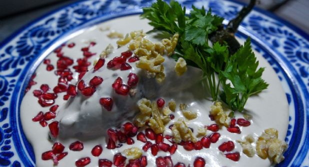 El chile en nogada consiste en un chile tipo poblano relleno de carne de res o puerco cocinada con manzana, plátano y bañando en salsa de nuez moscada. La granada arriba es un distintivo que no puede faltar.