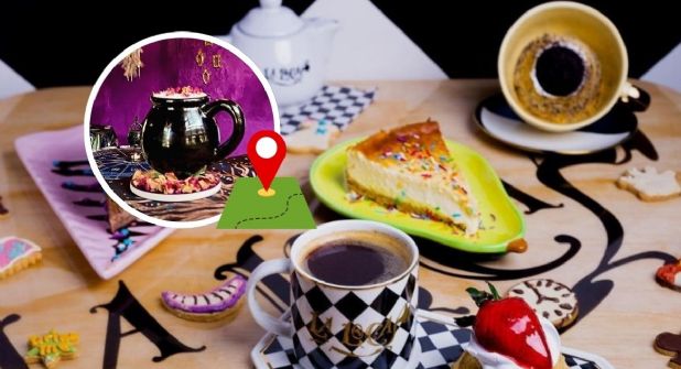 Esta cafetería está inspirada en Alicia en el País de las Maravillas, incluso, en temporada navideña colocaron un árbol de Navidad volteado con cartas como decoración. La decoración está llena de cartas, flores y luces moradas con rosas que te hace transportarte a un lugar mágico. Esta cafetería se ubica en la Avenida Manuel Ávila Camacho número 10.